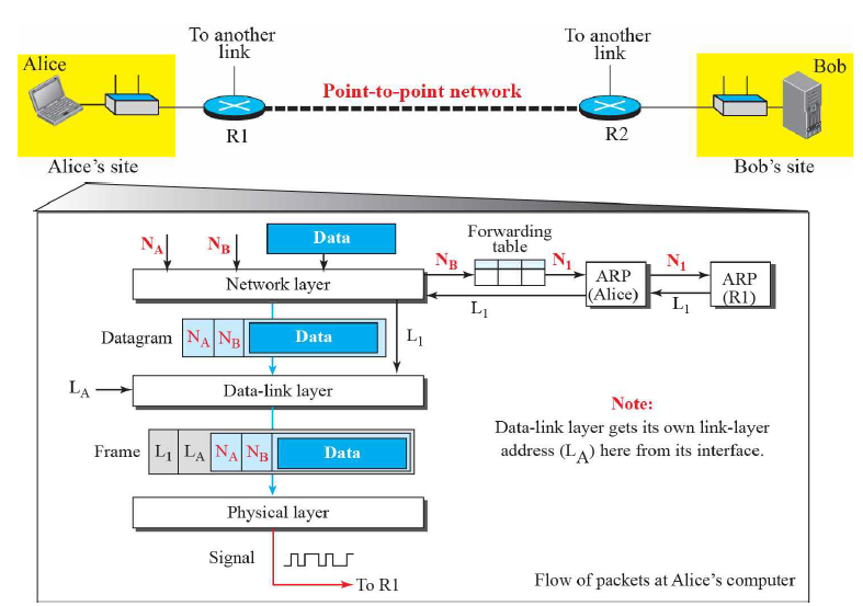 Alice에서 ARP로 R1의 데이터-링크 계층의 주소 L1을 받아와서