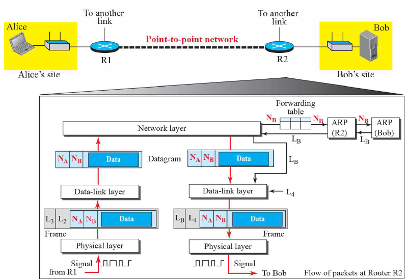 R2에서 ARP로 Bob의 데이터-링크 계층의 주소 LB을 받아와서