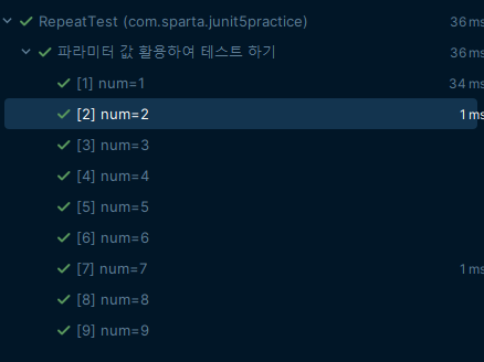 void repeatTest(RepetitionInfo info) { // RepetitionInfo : 반복 값을 파라미터로 받을 수 있다
