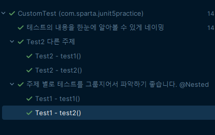 @Nested : 주제 별로 테스트를 그룹지어서 파악하기 좋다 (class-method)