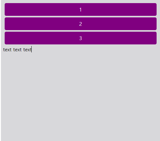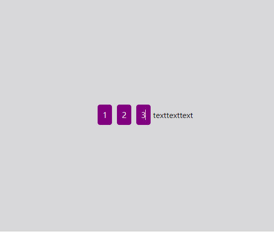 <!DOCTYPE html> <html lang="en"> <head> <meta charset="UTF-8"> <meta name="viewport" content="width=device-width, initial-scale=1.0"> <title>Document</title> <style> .container { background-color: rgb(216, 216, 219); margin: 10px; padding: 7px; height: 50vh; display: flex; /* 부모요소에 속성 적용해 줘야 한다. */ justify-content: center; /*flex(부모요소 기준)기준 가로 중앙*/ align-items: center; /*flex(부모요소 기준)기준 세로 중앙*/ } .box { background-color: purple; color: white; margin: 5px; padding: 10px; border-radius: 5px; text-align: center; } </style> </head> <body> <div class="container"> <div class="box">1</div> <div class="box">2</div> <div class="box">3</div> <span>text</span> <span>text</span> <span>text</span> </div> </body> </html>