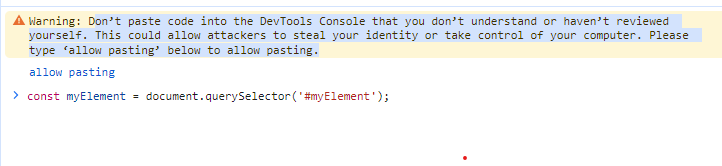 문제상황 : 브라우저 console 창에 실습코드를 붙여넣기 하니까 위와 같은 경고문구가 뜨면서 붙여넣기가 안됨