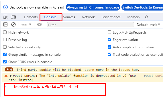 F12(단축키) or 브라우저 우클릭 - 검사 → console 창 클릭