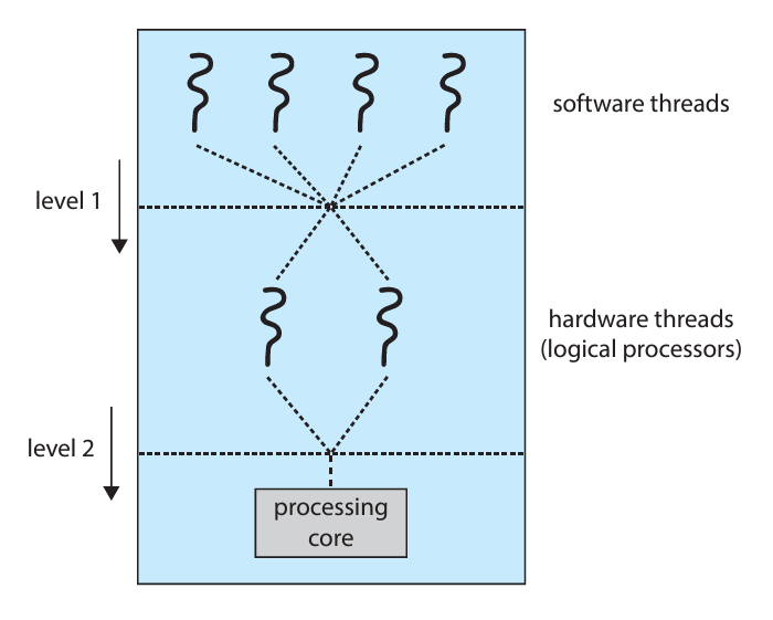 멀티코어 & 멀티쓰레딩 하드웨어에서는 2단계의 스케줄링이 필요하다.