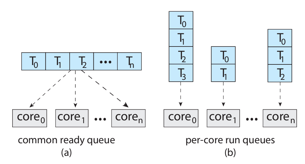 (a)는 여러 코어가 하나의 공용 큐를 사용하는 방식이다.