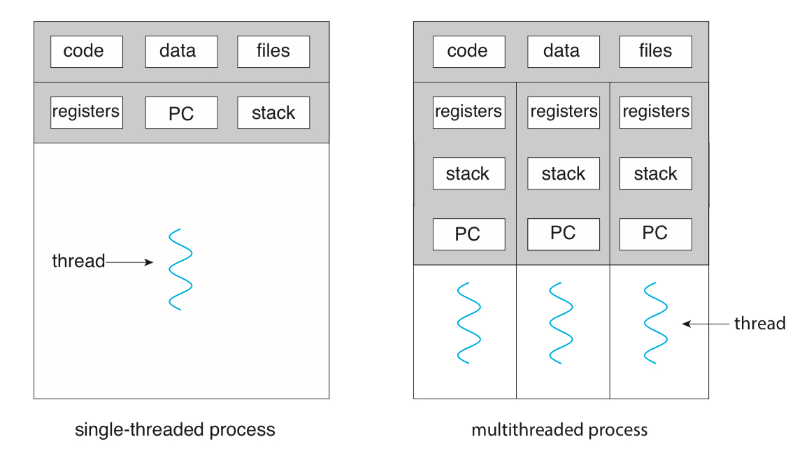 💡 A thread is a basic unit of CPU utilization; it compromises a thread ID, a program counter (PC), a register set, and a stack. It shares with other threads belonging to the same process its code section, data section, and other operating-system resources, such as open files and signals.
