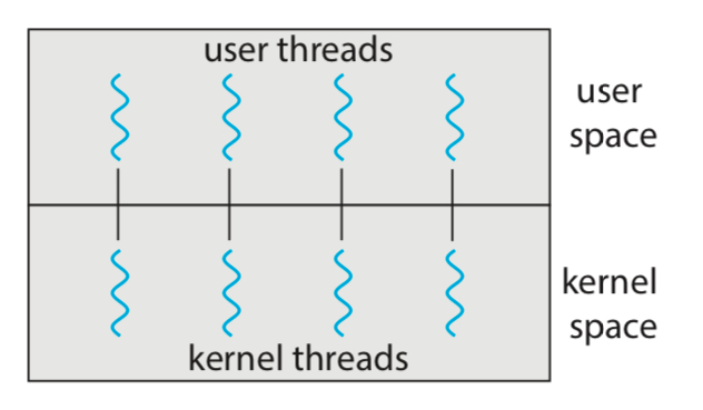 간단히 말해, 모든 유저 쓰레드가 각각의 커널 쓰레드와 매핑이 되는 것이다.