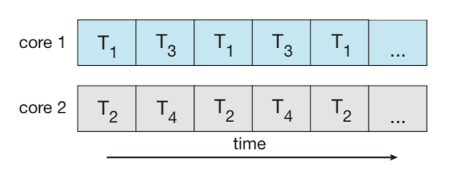 위의 그림을 보면, 코어가 하나인 경우에는 쓰레드 4개를 돌아가며 실행해야 한다.