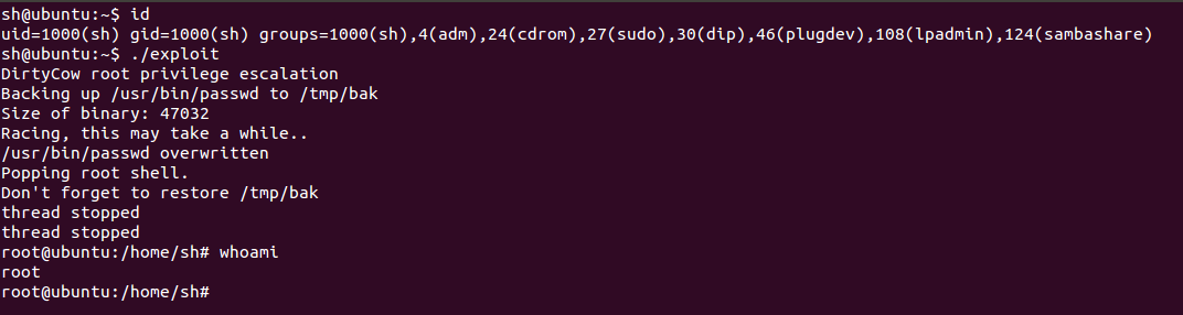권한이 없는 메모리에 쉘 코드를 덮어쓸 수 있게 되면서 최종적으로 root 권한을 탈취할 수 있게 된다. 레이스 컨디션으로 root권한을 탈취하는 방법을 알아보았다. Dirty COW의 경우 오래된 취약점이다 보니 커널드라이버 3.9 이하의 버전에서만 발생한다는 제약이 있으며, 자원의 무리한 사용으로 서버에 부하를 준다는 점, 간혹 재시작을 해야만 공격이 적용된다는 고질적인 문제가 있습니다.