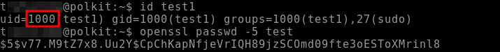 "test1" 사용자의 사용자 ID와 그룹 ID를 표시한후 사용할 패스워드 해시를 생성합니다.