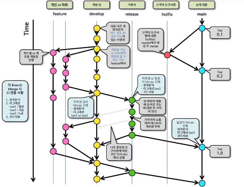 - 팀원은 별도의 브랜치 (topic 브랜치)를 생성후 push 하고 merge 요청(PR : Pull Request)- 팀장 이 승인후 dev 브랜치에 머지