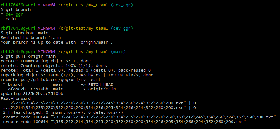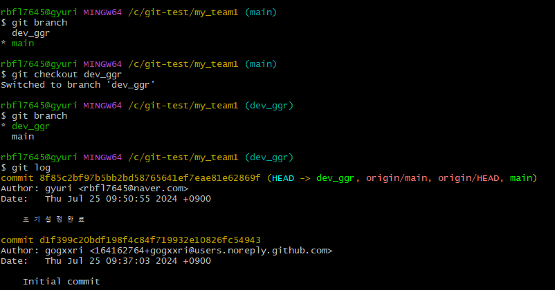 $ git clone 원격레파지토리주소6. 브랜치 생성 및 작업 (팀원)