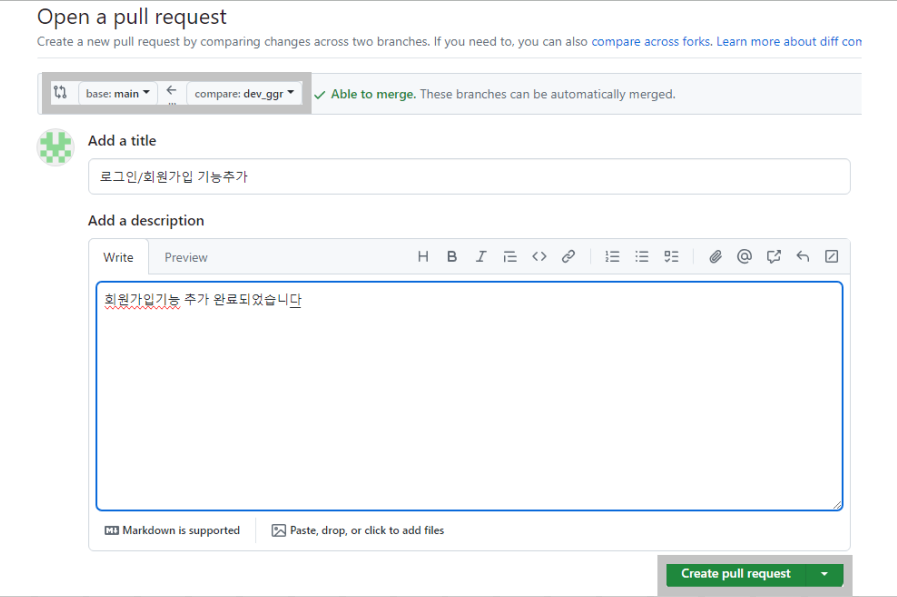 - 테스트가 완료되면 master 브랜치와 develop 브랜치에 병합