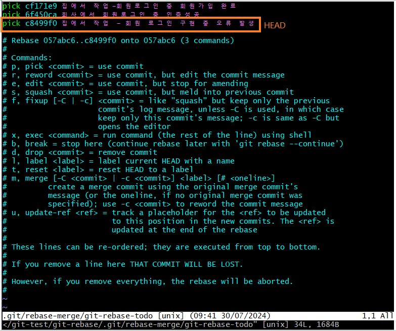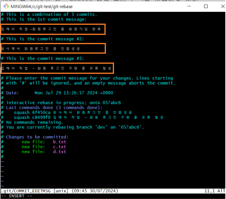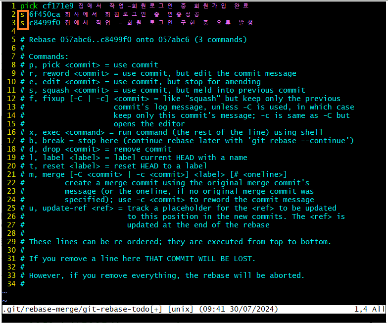 insert모드로 바꿔서 squash 할 부분의 pick을 지우고 s로 변경