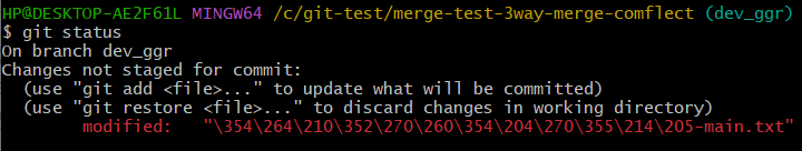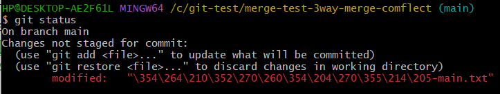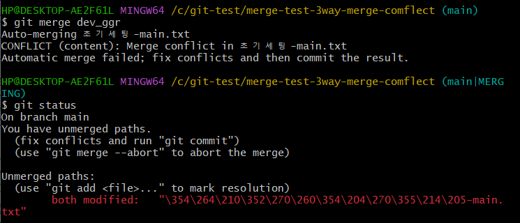 CONFLICT (content): Merge conflict in 초기세팅-main.txt을 통해 초기세팅-main.txt 파일에서 병합 충돌 발생을 알 수 있음$ git status 로 충돌 파일 볼 수 있음