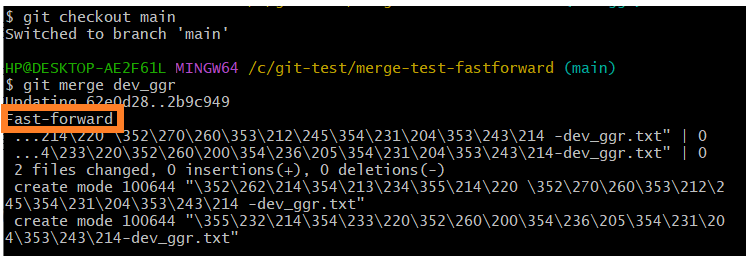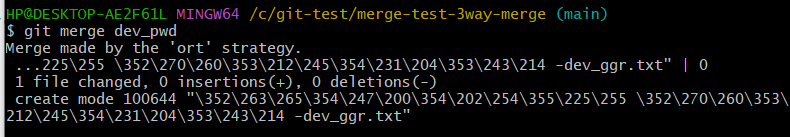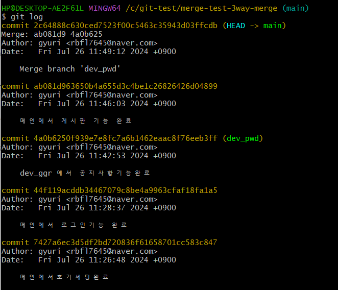$ git merge dev_ggr하면 main 브랜치에서 dev_ggr을 병합