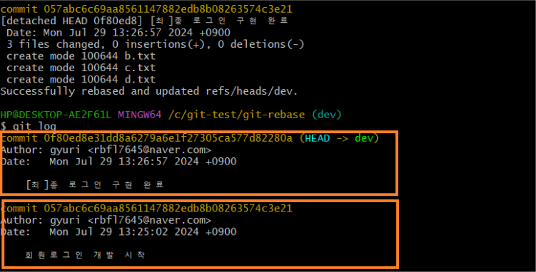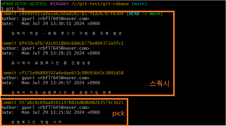 log로 커밋이 합쳐진 것 확인 가능