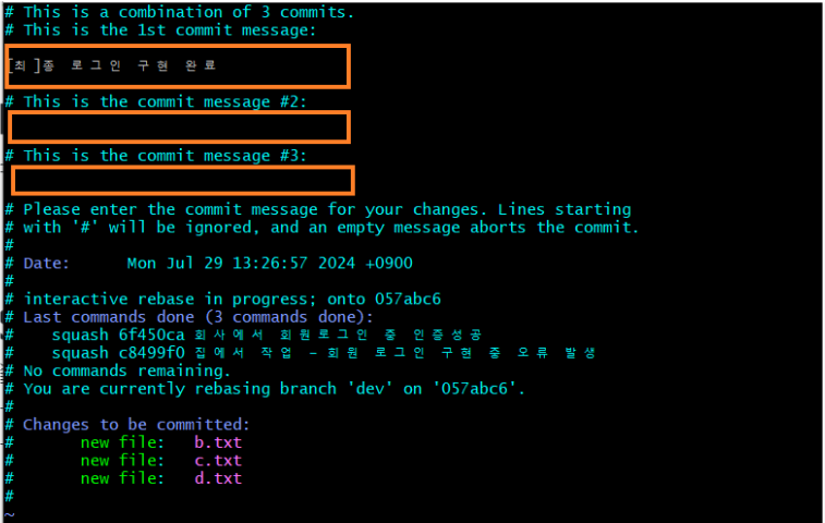 스쿼시된 커밋의 메시지는 이전 커밋 메시지와 함께 편집 가능