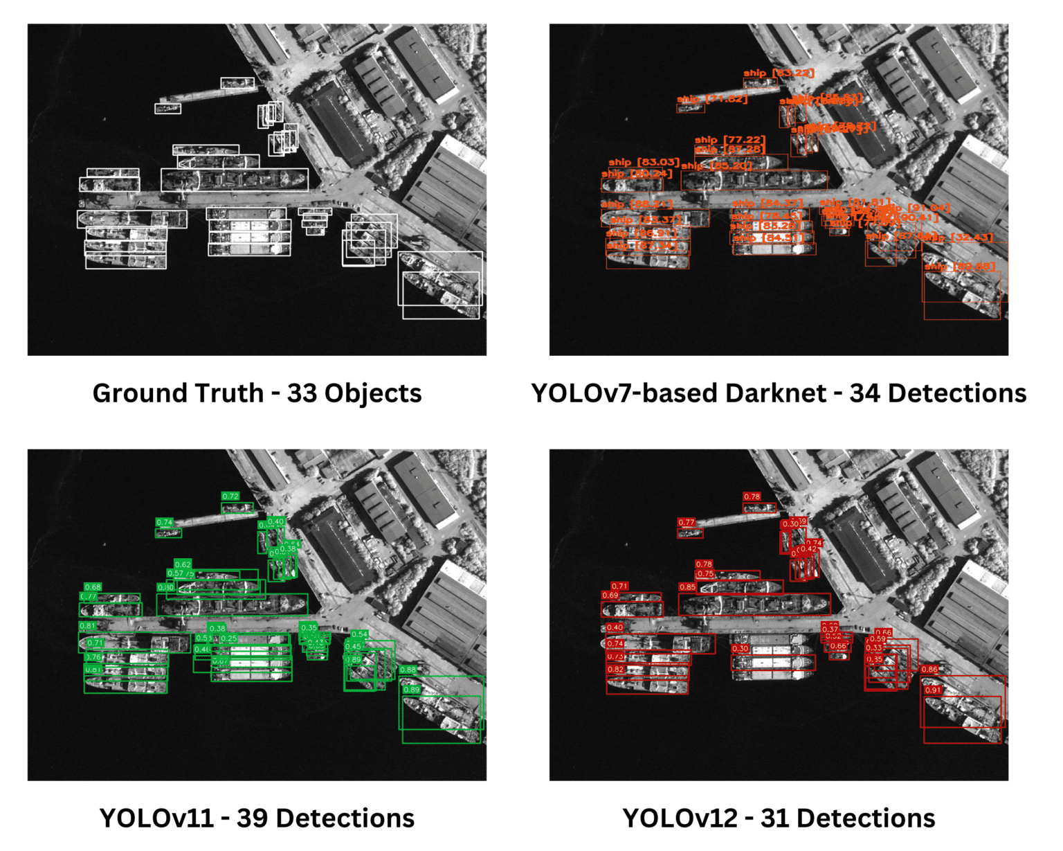 주어진 이미지는 특히 밀집된 작은 객체 탐지 상황에서 객체 탐지 모델을 평가하는 데 이상적인 테스트 사례이다. 단순한 비교에서는 YOLOv12가 더 많은 객체를 탐지했기 때문에 다른 모델보다 우수해 보일 수 있다. 그러나 자세한 분석 결과, YOLOv12의 많은 탐지가 중복되었거나 불필요한 예측(오검출)임이 밝혀졌다. 반면, Darknet 기반 YOLOv7은 탐지한 객체 수는 적었지만, 오검출과 중복이 최소화된 높은 정확도를 보였다. 객체 탐지 모델의 성능을 평가할 때는 단순한 탐지 개수가 아니라, 정확도(Precision), 재현율(Recall), 오검출율(False Detection Rate) 등을 종합적으로 고려해야 한다.