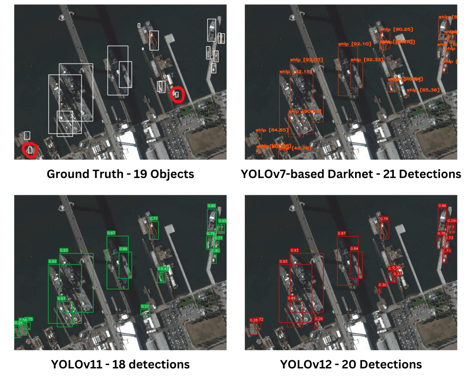 세 개의 모델 모두 주어진 실제(Ground Truth) 이미지에서 유사한 성능을 보였다. Darknet은 다른 모델들이 놓치거나 덜 정확하게 탐지한 작은 객체들을 더 정확하게 식별하는 성능을 보였다.