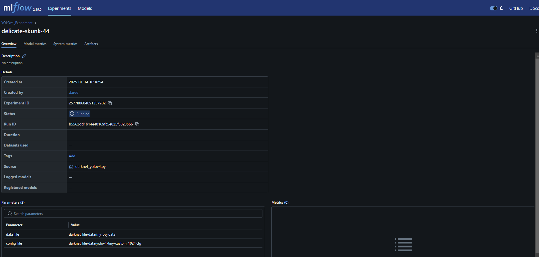 실행되고 있는 실험에 들어가보면 아래와 같이 상세한 정보가 나오고 설정한 실험 파라메터와 metric을 볼 수 있다