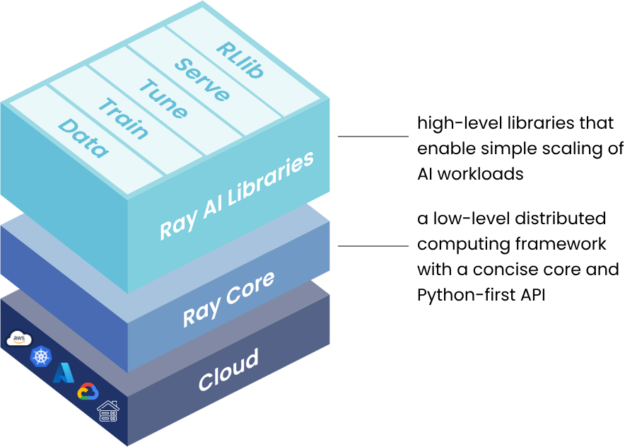 Ray는 machine learning과 같은 AI 및 Python 애플리케이션을 확장하기 위한 오픈 소스 통합 프레임워크입니다. 분산 시스템 전문가가 될 필요가 없도록 병렬 처리를 위한 계산 레이어를 제공합니다.