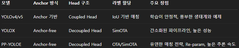 라벨 할당(label assignment) 과정에서 OTA(Optimal Transport Assignment)나 SimOTA 같은 동적 할당 기법을 차용해, 학습 시 각 예측 박스에 더 적절한 타겟을 할당하고 손실 함수를 효율적으로 계산할 수 있게 합니다.