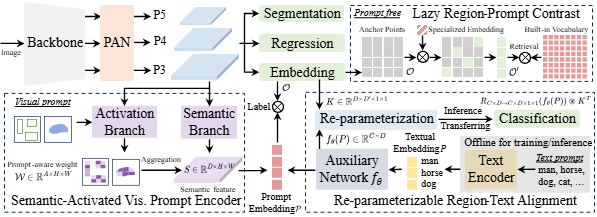 YOLOE는 기본적으로 Backbone(특징 추출부), Neck(피처 피라미드, 특징 통합부), Head(디텍션 결과 산출부)로 구성되는 전형적인 1-Stage 검출 프레임워크를 따릅니다. 다만, 각 구성 요소마다 다음과 같은 개선 사항이 반영되어 있습니다.