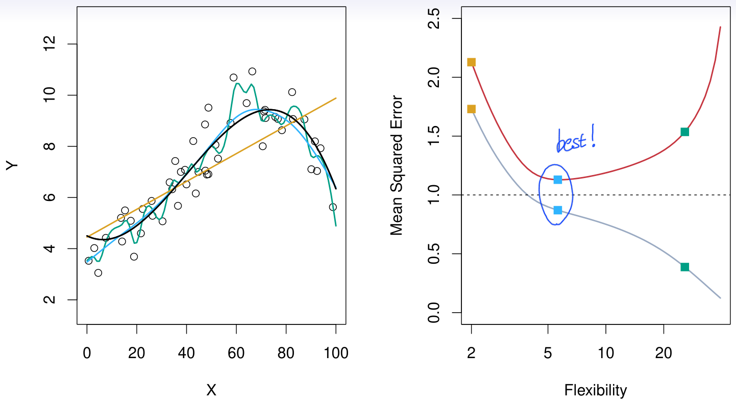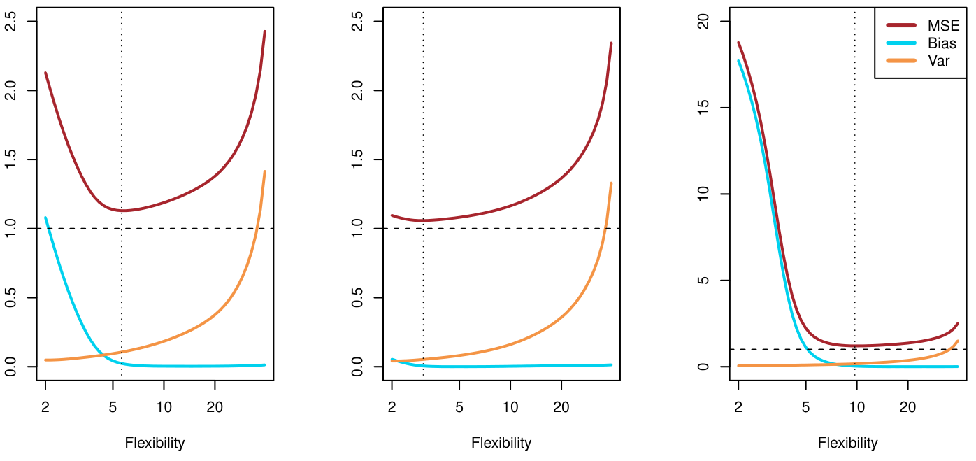 일반적으로, f의 flexibility가 올라가면, variance는 증가하고 bias는 감소하게 된다. 이러한 관계를 bias-variance trade-off 라고 말한다.