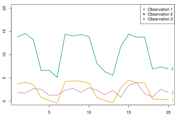 위 그림을 보면, Euclidian distance 기준으로는 observation 1 과 3이 더 가깝다고 볼 수 있으나, correlation-based distance 관점에서는 observation 1 과 2가 더 가깝다고 볼 수 있다.