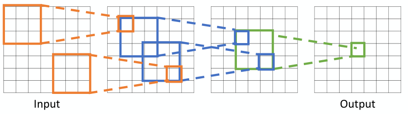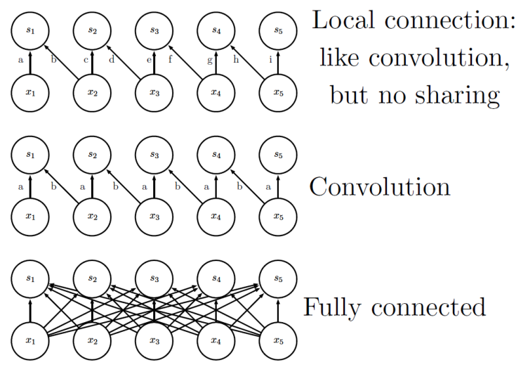 일반적인 FNN 모델의 경우, 모든 output unit은 모든 input unit과 연결성을 가지고 있다. 그러나, CNN의 경우 filter를 통한 연결성을 가지고 있기에, 각 output unit이 input unit의 일부에만 영향을 받는다. 특정 output unit을 계산하는데 관여하는 input unit들의 영역을 receptive field라고 하는데, 이는 layer를 거칠수록 점점 커지게 된다.