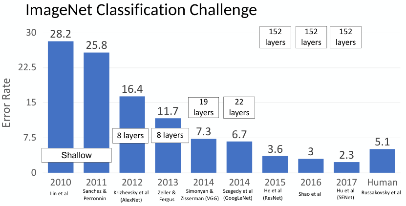 그러나, CNN은 등장 초기부터 주목받은 것은 아니었다. CNN 뿐만 아니라 deep learning은 ImageNet Classification Challenge (정식 명칭: ILSVRC)에서 2012년 AlexNet이 획기적인 성과를 거둔 것을 계기로 크게 성장하였다.