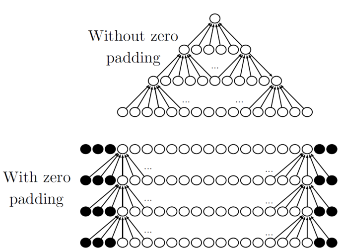 Zero padding을 사용하지 않으면, convolution 연산 후에 output의 크기가 계속 감소하게 된다. 또한, zero-padding을 통해 input의 가장자리 부분에 대한 정보가 손실되지 않도록 할 수 있다.