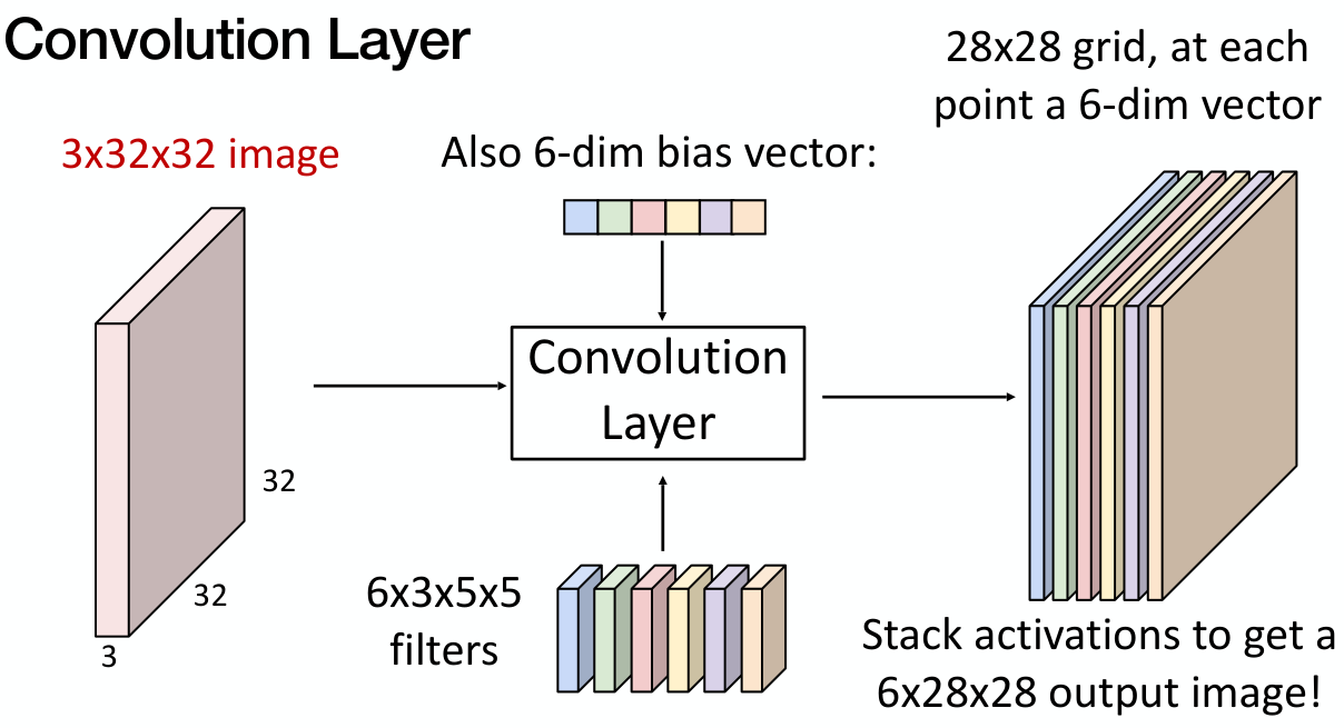 Convolution layer는 여러 개의 filter를 가질 수도 있다. 하나의 filter가 하나의 activation map을 만들기 때문에, 최종적으로 convolution layer의 output의 차원은 'filter 수'x28x28 이 된다.