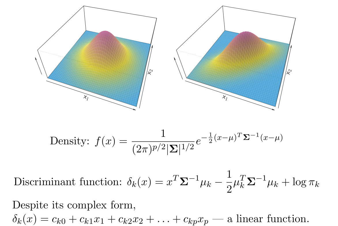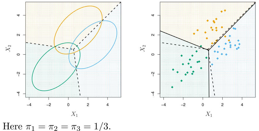 각 class 별 X의 distribution을 modeling하고, Bayes theorem을 적용해 Pr(Y∣X)를 얻는다. 이를 discriminant analysis 방법이라고 한다.