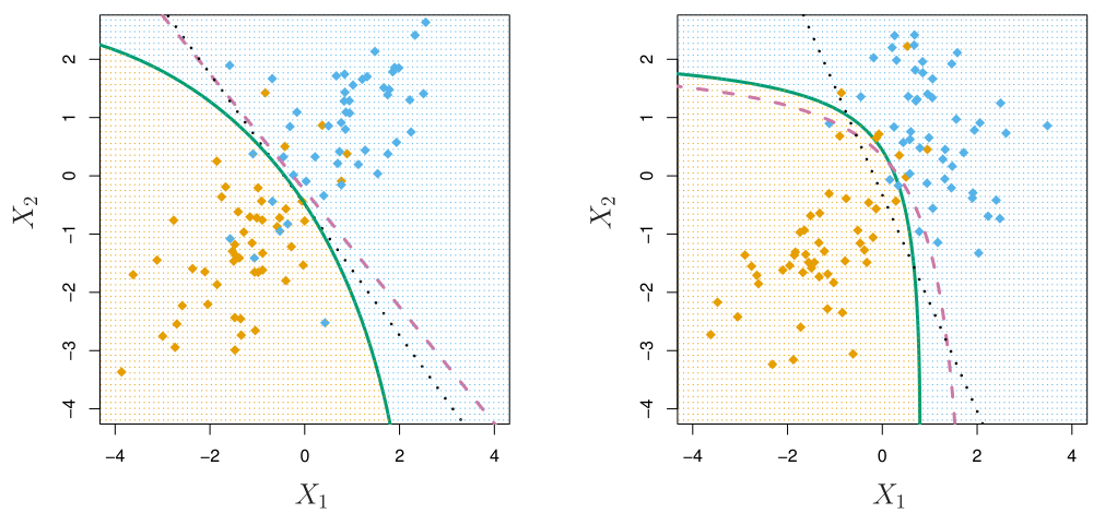 현실에서는 별로 그럴 일은 없지만, data가 well-seperated 되어있는 경우에 logistic regression model은 unstable하다 (결과의 차이는 없을지라도). 하지만 discriminant analysis을 사용하면 안정적인 model을 가질 수 있다.