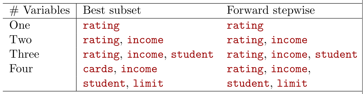 위는 동일한 feature에 대해 best subset과 forward stepwise 방법을 각각 적용했을 때의 예시이다. Best subset은 '# Variables'가 달라짐에 따라 best subset의 feature들이 완전히 달라질 수 있지만, forward stepwise는 직전 결과에 하나씩만 feature가 추가되는 것을 볼 수 있다.
