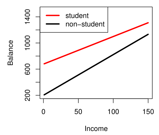 balancei≈β0+β1×incomei+{β2+β3×incomei0if studentif not student={(β0+β2)+(β1+β3)×incomeiβ0+β1×incomeiif studentif not student