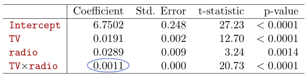 즉, radio와 TV간 synergy effect가 존재한다. 이 경우, model은 다음과 같이 표현하는게 더욱 정확할 것이다.