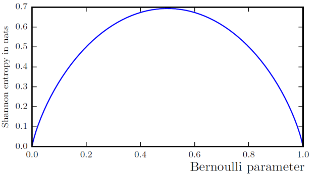 예를 들어, Bernoulli distribution을 고려하자. 이 때의 entropy는 다음과 같이 정의된다.