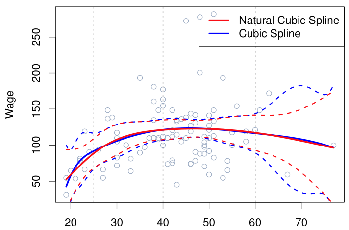 Cubic spline은 polynomial regression이 갖는 낮은 extrapolation 성능 문제를 여전히 가지고 있다. 이러한 문제를 완화하고자, K개의 knots가 있을 때, 첫번째와 마지막 구간의 경우 linear spline을, 사이 구간들은 cubic spline을 적용하는 방법을 생각해 볼 수 있다. 이를 natural cubic spline이라고 한다.