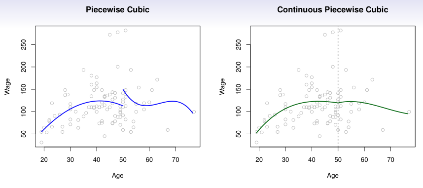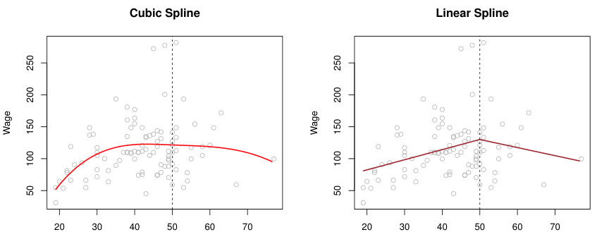 Spline은 구간을 구분짓는 knot을 어떻게 설정하는지가 중요한 의사결정 요소이다. 무수히 많은 knot은 model의 flexibility를 지나치게 키울 수 있으므로 주의해야 한다.