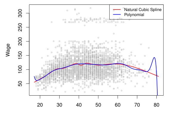 아래 그림은 degree-14 polynomial과 natural cubic spline(둘 다 dof=15)를 나타낸다. 동일한 dof를 갖지만 natural cubic spline이 더 안정적인 형태를 가지는 것을 볼 수 있다.