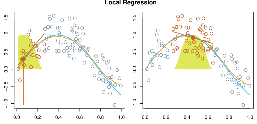 Local regression이란 특정 data point 근처의 다른 data point들로부터 해당 지점에서의 prediction을 수행하고, 이를 모든 data point 지점에 대해 수행하여 non-linear function을 만들어 내는 방법을 말한다.