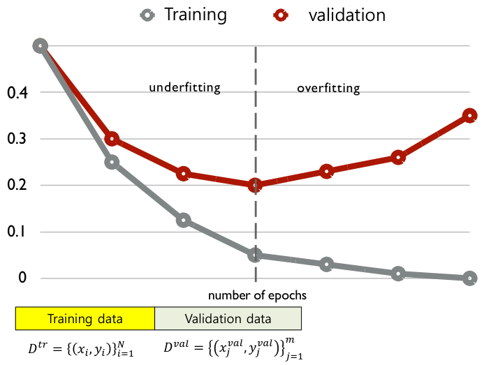 Test set performance를 미리 알 수 없기에, 이를 예측하기 위해 validation error가 최소화되는 지점에서 train을 종료한다.