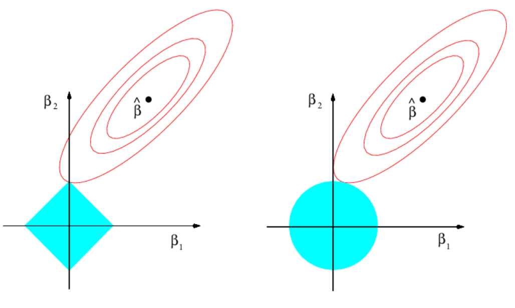 두 optimization 문제를 그림과 같이 표현하면 각각 아래와 같다 (왼쪽: Lasso, 오른쪽: Ridge).