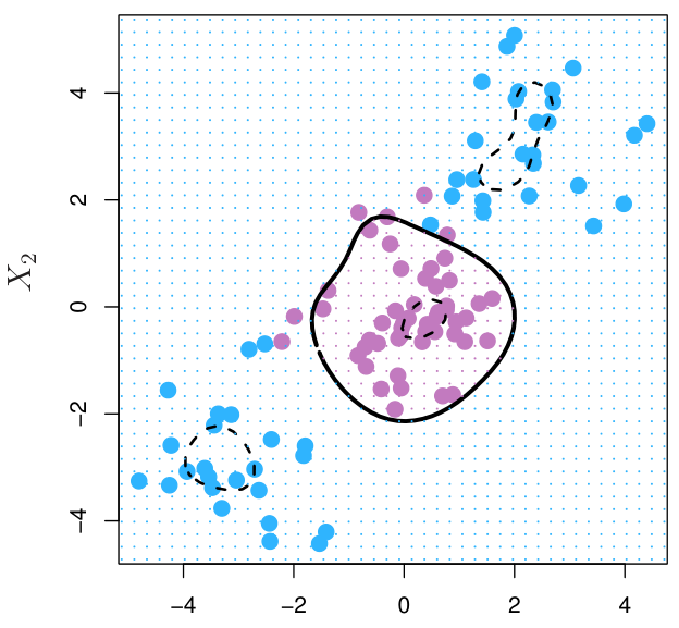 RBF kernel은 널리 사용되는 non-linear kernel 중 하나로, infinite dimension으로의 mapping이 가능하여 매우 유연한 hyperplane을 만들 수 있다.