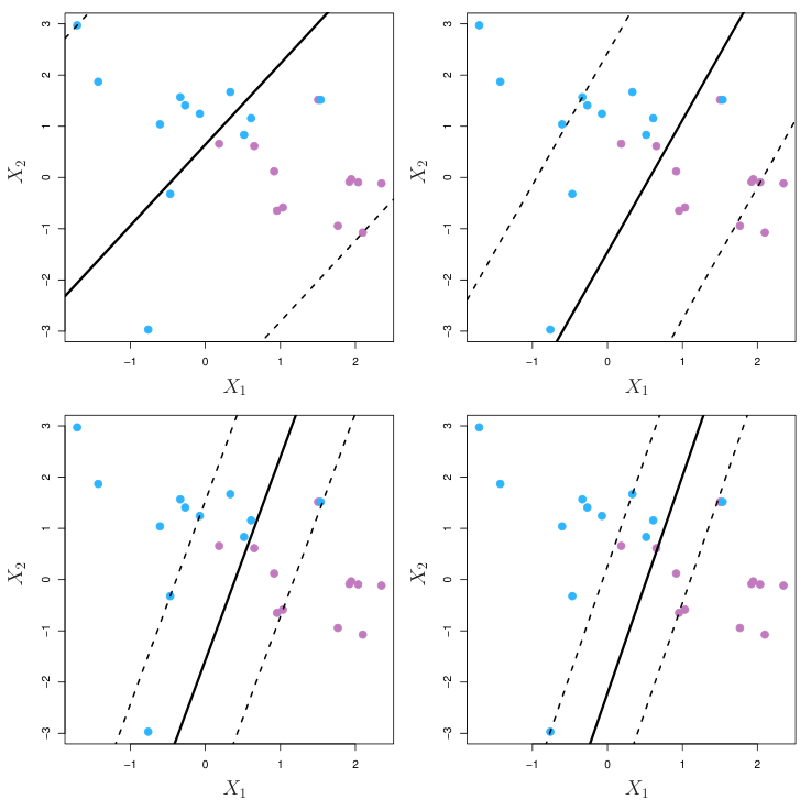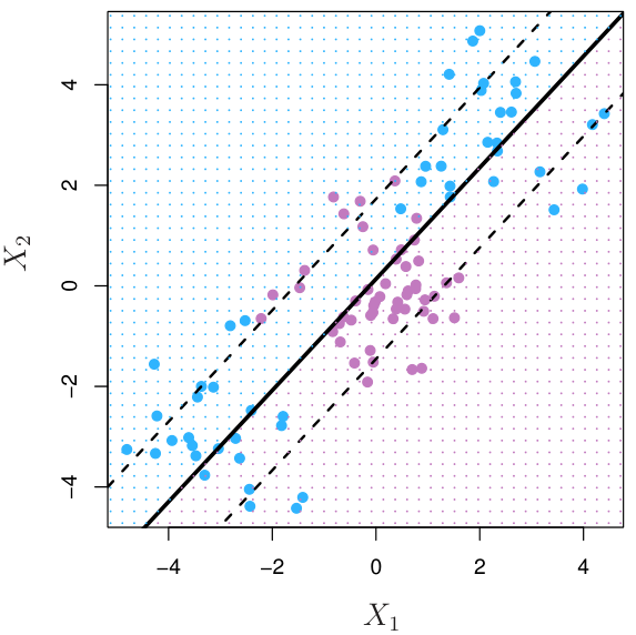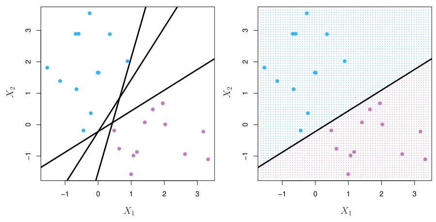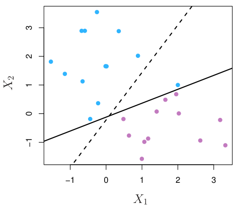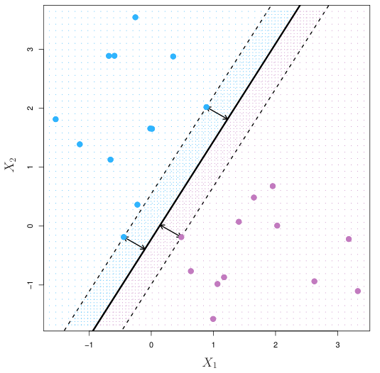 모든 가능한 seperating hyperplane f(X) 중에서, maximal margin classifier는 두 class 사이의 gap 또는 margin을 maximize하는 seperating hyperplane을 말한다.