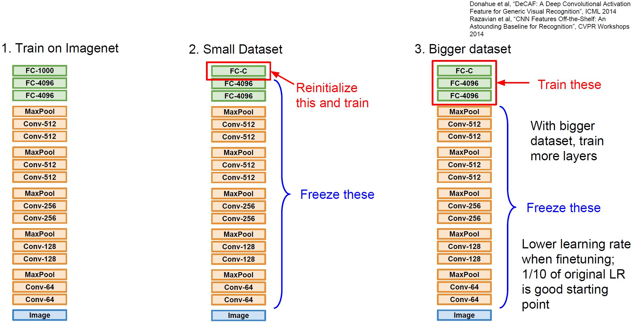 Fine-tuning은 한 가지 방법이 존재하는 것이 아니라, 새로운 dataset과 이전 dataset이 비슷한 지, 그리고 새로운 dataset의 양 등에 따라 적절한 fine-tuning 방법이 달라진다.