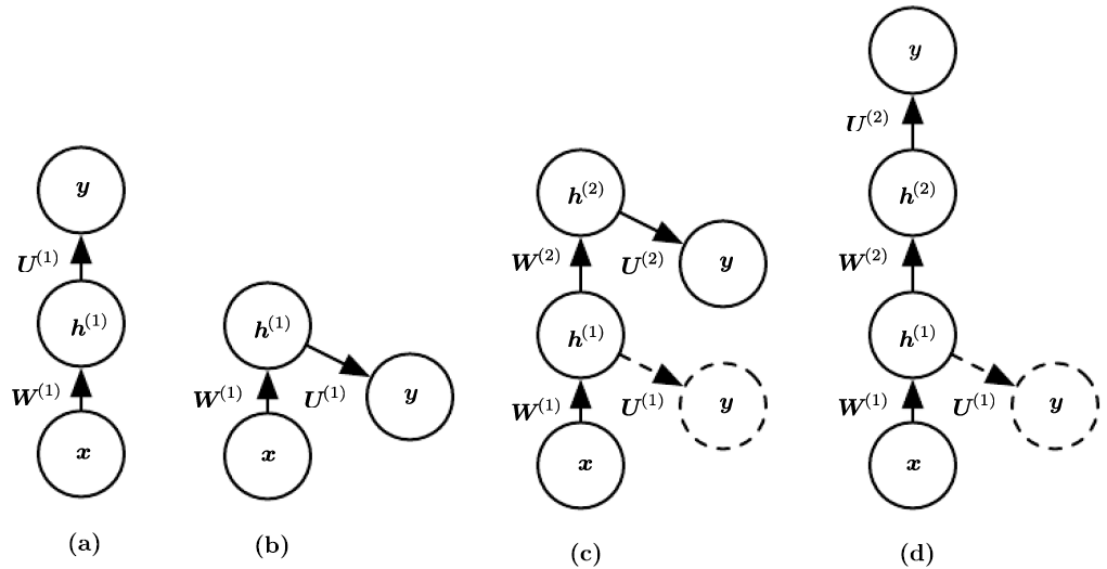 Greedy supervised pretraining에서는 우선 shallow model을 학습시킨 후, 해당 model의 parameter를 고정시킨 채 새로운 layer를 얹어 새로운 layer에 대한 parameter만 학습시킨다. 이후, 해당 모델들의 parameter를 고정시키고 새로운 layer를 추가하고 학습하는 작업을 반복하는 것이다.